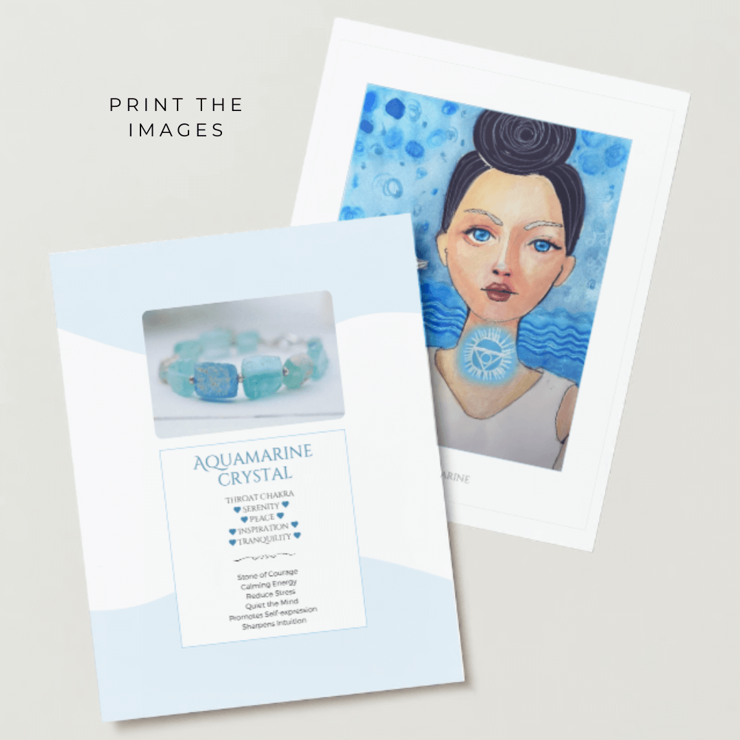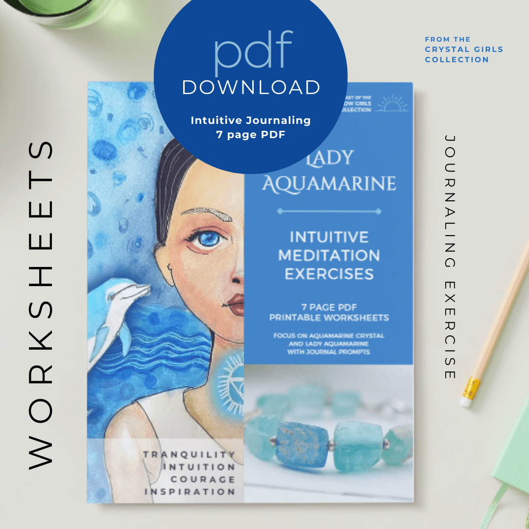 Develop your intuition with this beautiful journal exercise. In this worksheet pack, you will print two images – one of the Aquamarine crystal gemstones (and healing properties), and then a drawing of “Lady Aquamarine” from the Crystal Girls Collection.